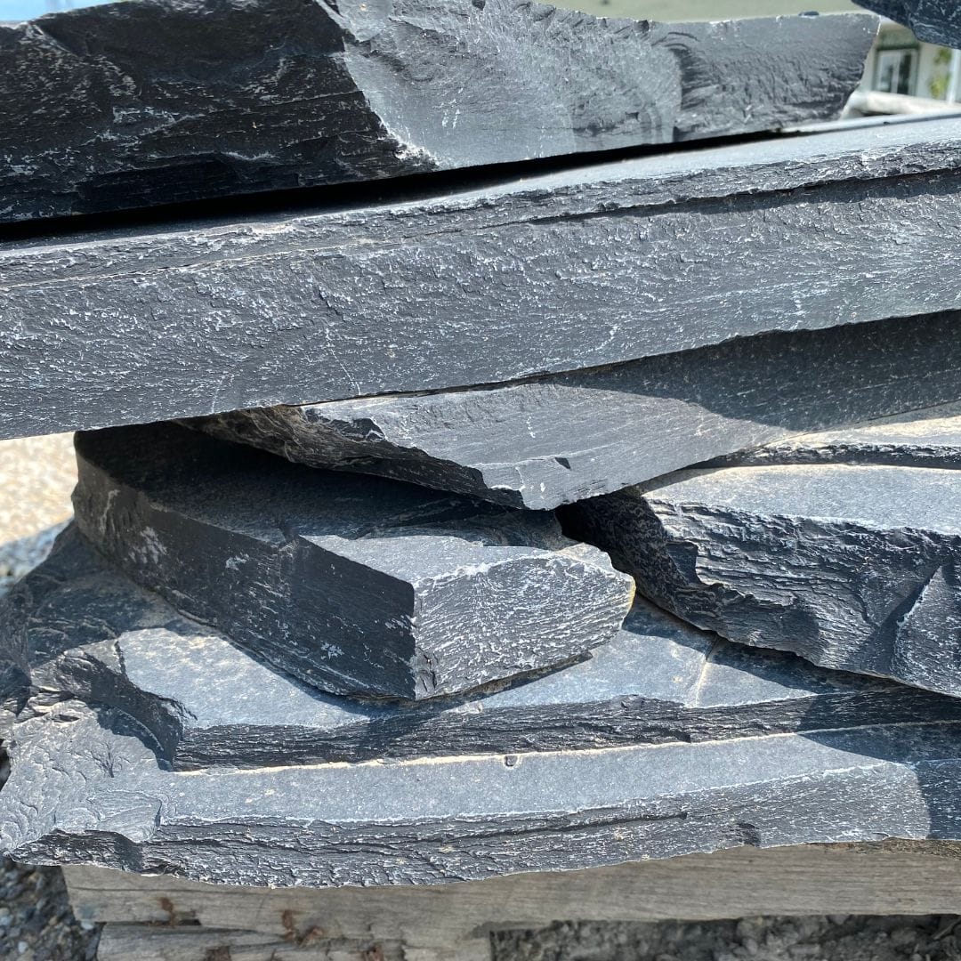 A slightly riven surface for texture and evenly colored black-charcoal slabs of stone. Average coverage per ton of flagstone is about 80 sqft.