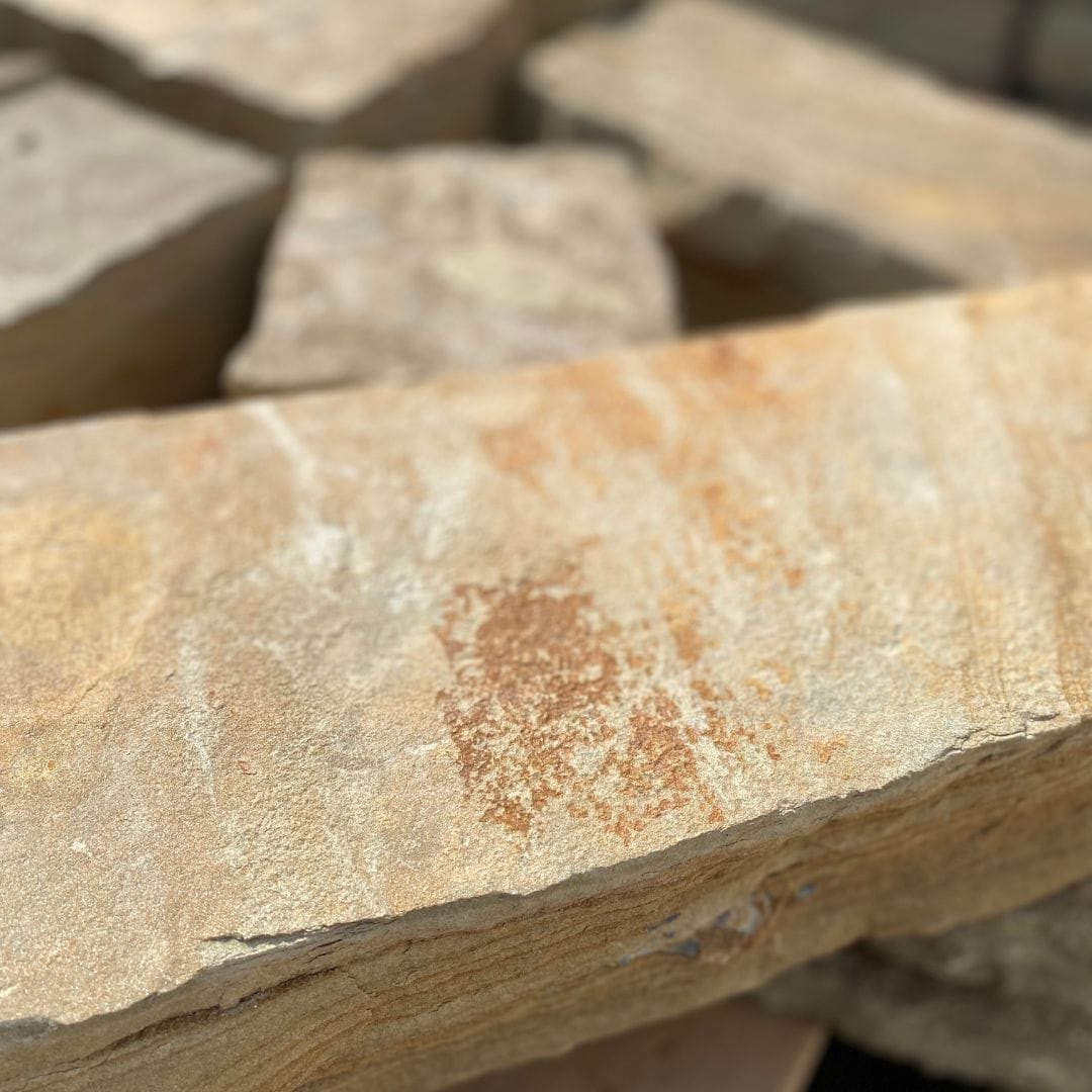 Natural stone cut to shape for construction of retaining walls, garden borders, and other garden structures. Typically rectangular, with one or more flat faces, allowing them to be interlocked without the use of other binding agents.