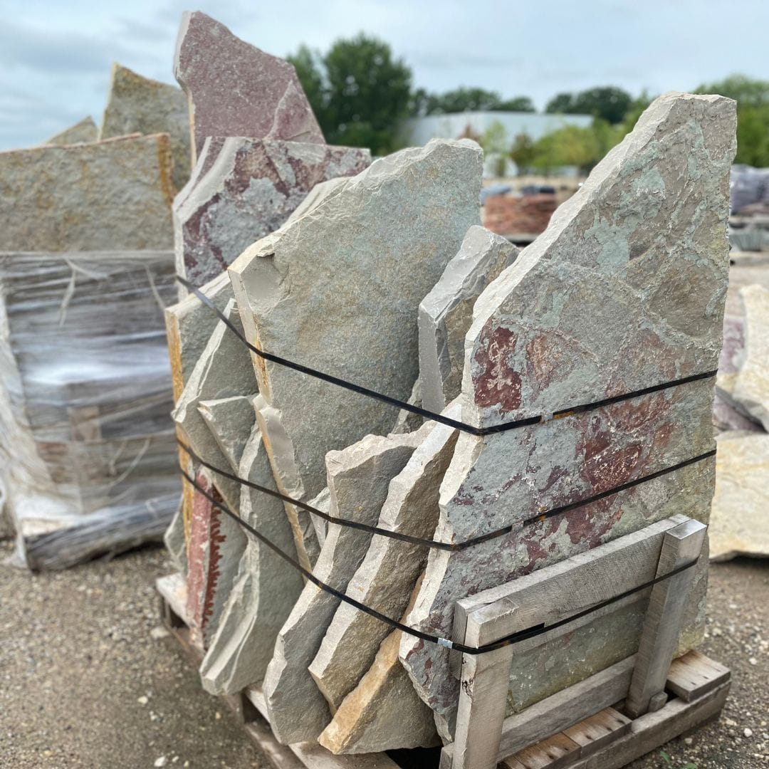 One of the most uniquely colored natural stones we offer. Colors range within each slab; including purples, mauves, buff, cream, grays, and blues. Average coverage per ton of flagstone is about 80 sqft.