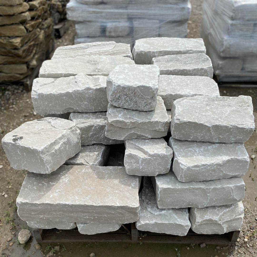 Natural stone cut to shape for construction of retaining walls, garden borders, and other garden structures. Typically rectangular, with one or more flat faces, allowing them to be interlocked without the use of other binding agents.