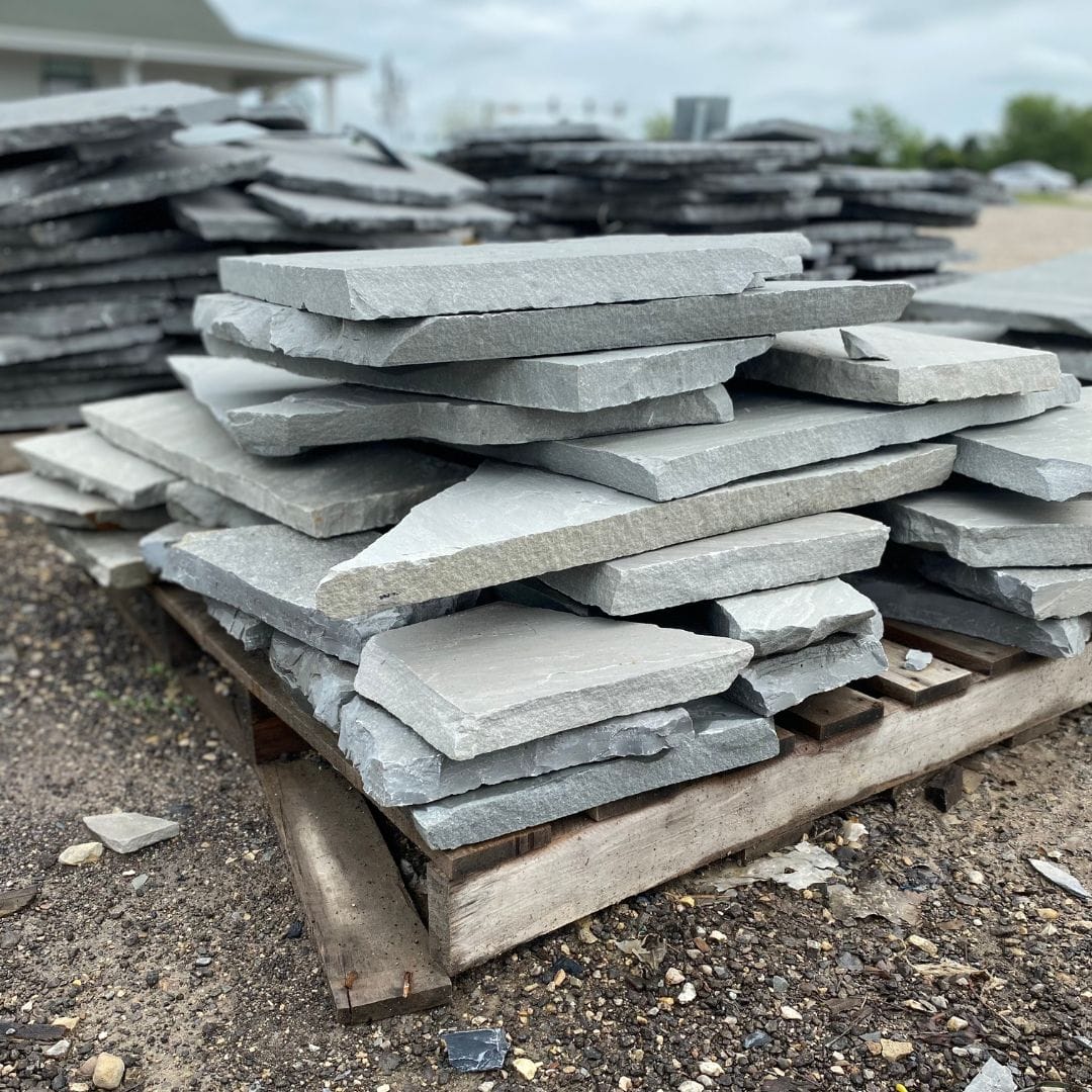 Fusions of dark and light gray stone with occasional rust-colored splotches. A type of sandstone, it appears soft and brings a refreshing feel to landscape applications. Average coverage per ton of flagstone is about 80 sqft.
