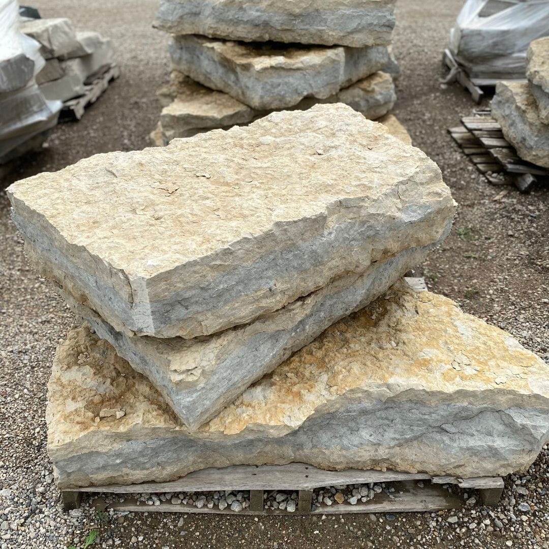 Colors in Mill Creek Outcropping range from light grays to buffs with some blue veins and a rough texture. Use as key focal points in mulch beds or as restoration stones for creek shores.