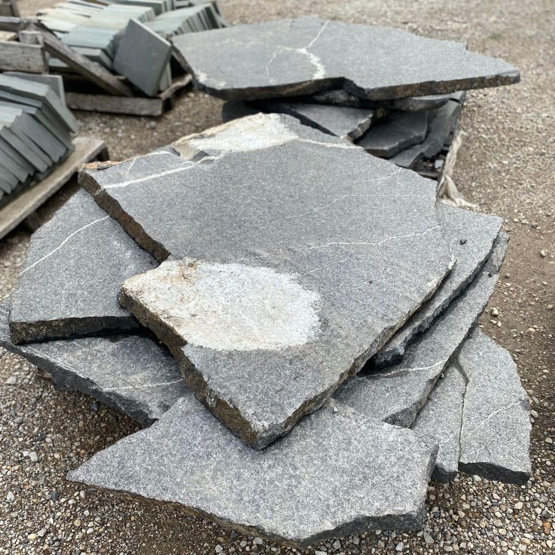 Thermal-top finish accentuates the stones character but also creates a non-skid surface. Great for residential, commercial, and exterior applications. Stone is dark charcoal colored and has lighter, starry-like flecks within it. Average coverage per ton of flagstone is about 80 sqft.